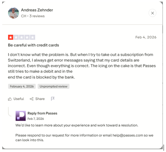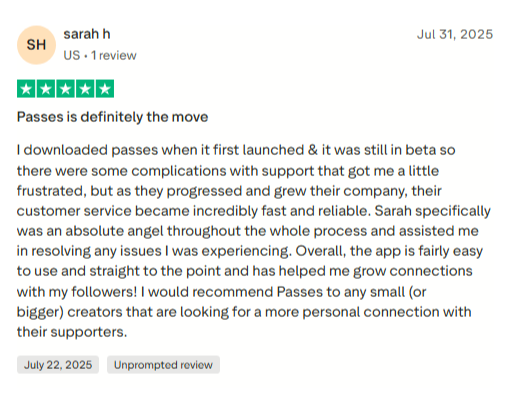 Sarah h said she joined when Passes was still in beta, had frustrations, then saw customer service become “fast and reliable,” and praised a support rep named Sarah who helped resolve issues.