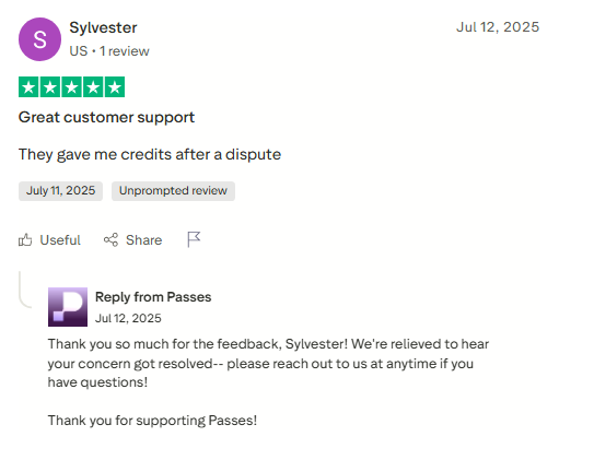 Sylvester’s review is short, but clear: they said Passes gave them credits after a dispute.