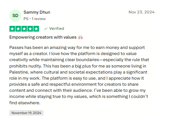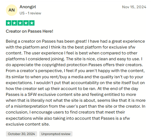 Add to the many positive sides of Passes is its safe-for-work positioning. Even the “no nudity” boundary comes up as a real differentiator in creator feedback.